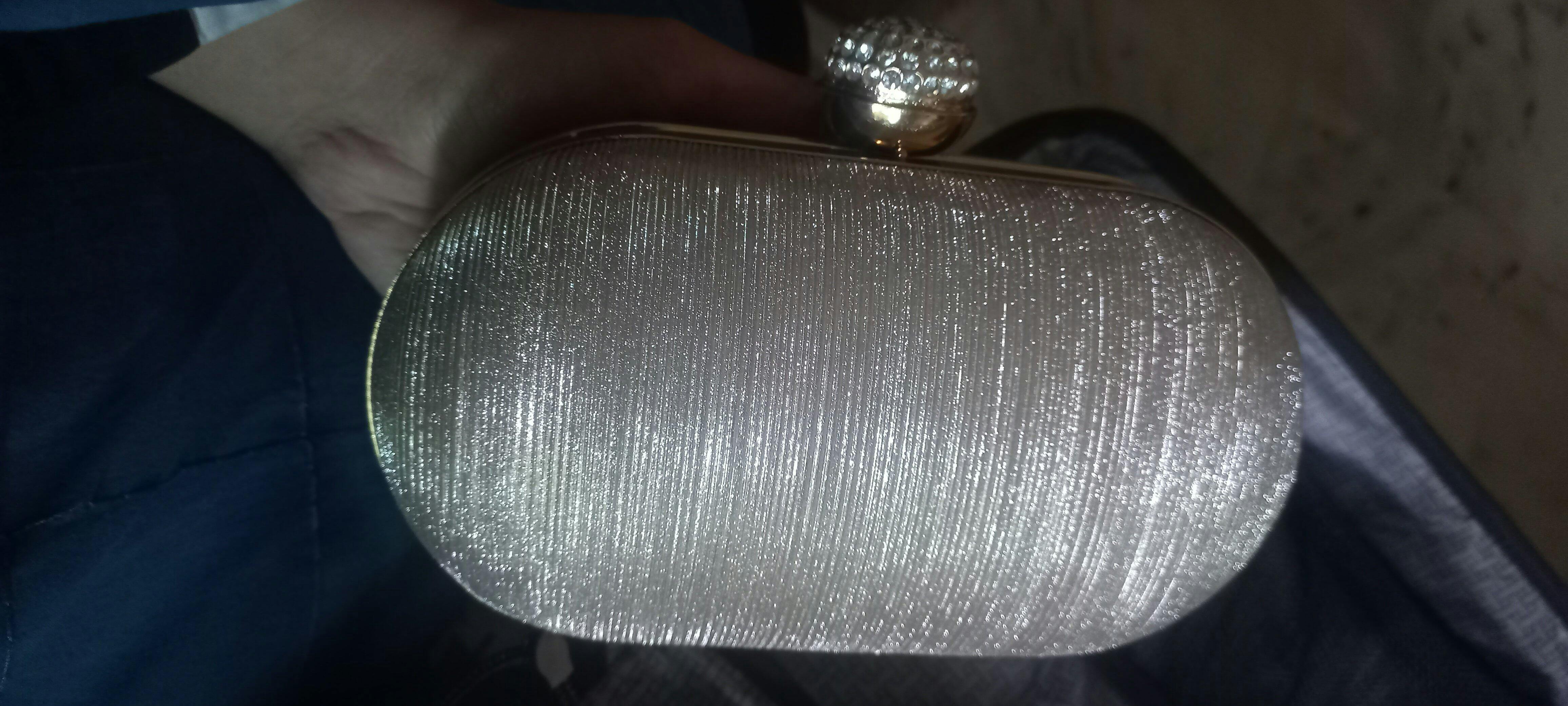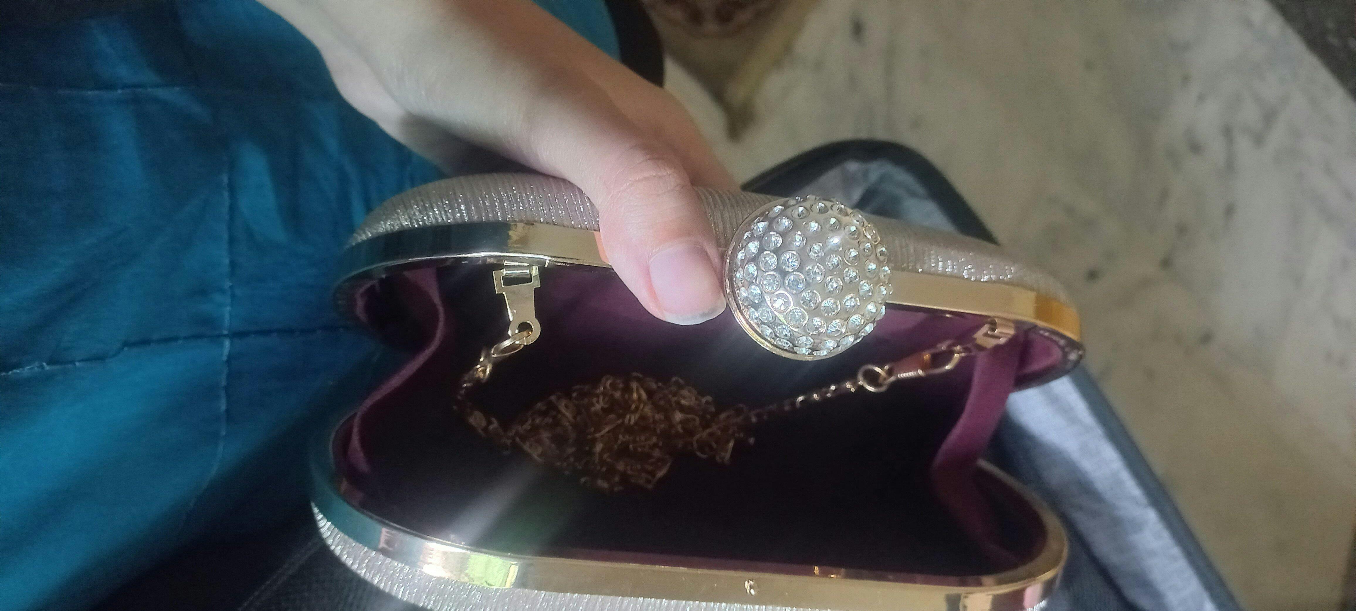 Make a statement at any special occasion with this stunning evening clutch. Featuring a shimmering rhinestone-studded exterior and a sleek metallic frame, this bag exudes sophistication and luxury. The secure clasp closure keeps your essentials safe, while the detachable chain strap offers versatility to wear it as a handbag or crossbody.